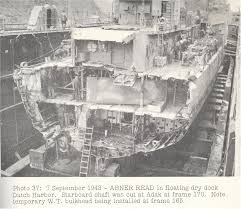 The crew was able to keep the destroyer afloat. The ship was shored up as best they could, the main compartment was kept water tight, and a homemade rudder was attached. Two U.S. Navy ships then towed the Abner Read to port.